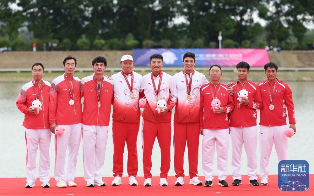 男子双人双桨冠军广东队选手倪旭林(右四)/聂毅德(中)、亚军湖南队选手伊绪帝(左三)/张亮(左二)、季军贵州队选手赵超(右一)/李林富(右二)和教练在颁奖仪式上合影。新华社记者 潘昱龙 摄