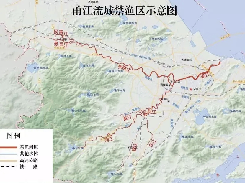 甬江流域禁渔期制度禁渔区为121°43′25.40″E,29°57′46.12″N与121°43′40.49″E,29°57′39.72″N连线以上的甬江;以及姚江、最良江、候青江、奉化江、县江、鄞江、四明江、东江、剡江。