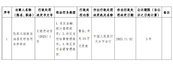 11月18日金融一线消息宏源证券,中国人民银行天水市分行行政处罚决定信息公示表显示,张家川回族自治县农村信用合作联社因违反金融统计管理规定;违反支付结算管理规定;违反货币金银管理规定,被中国人民银行天水市分行警告,并处24 万元罚款。